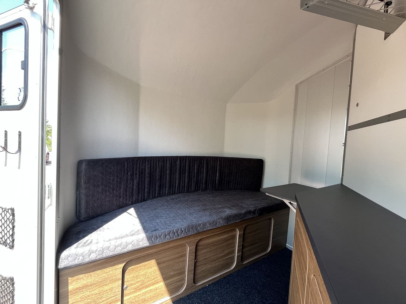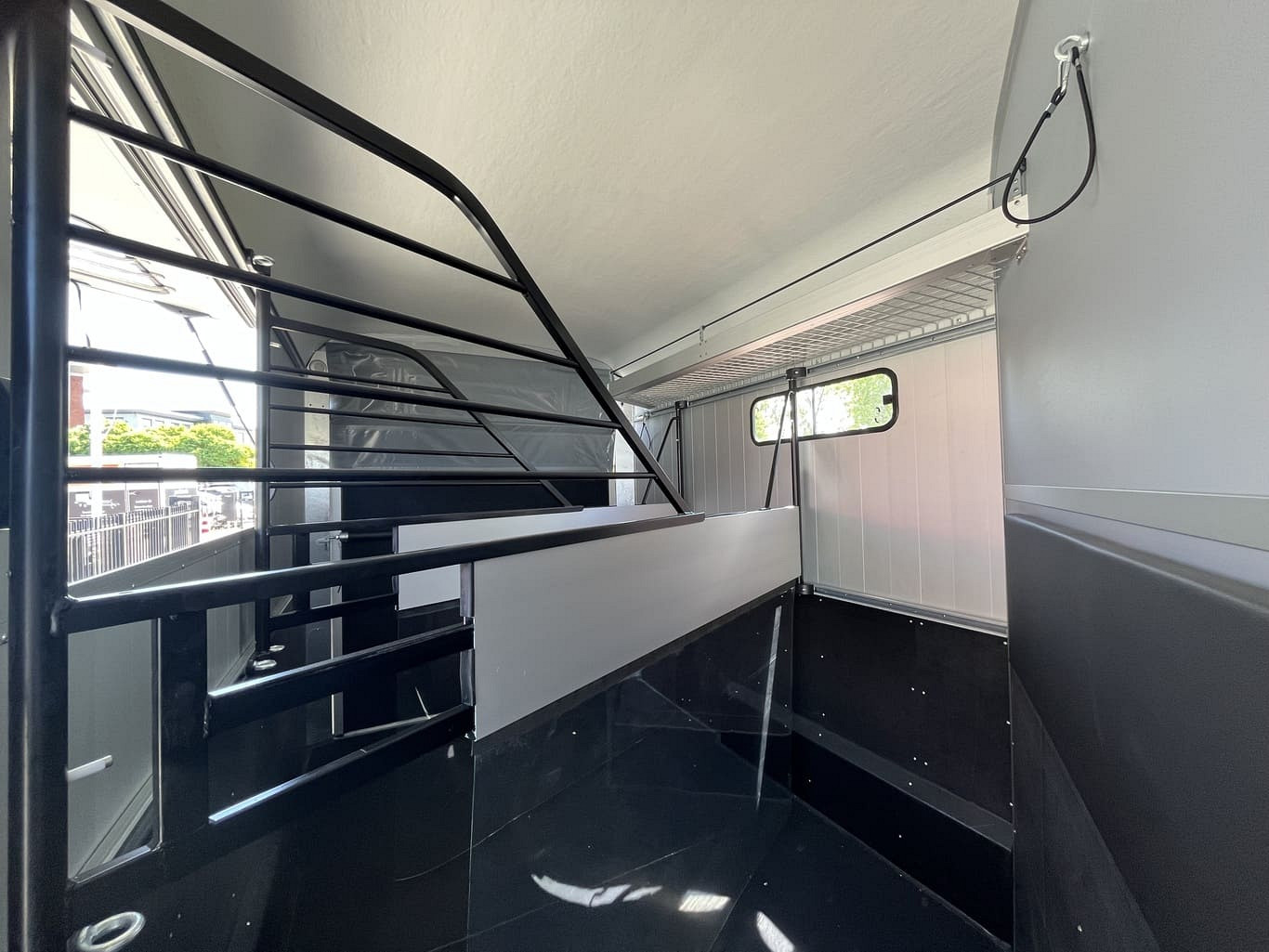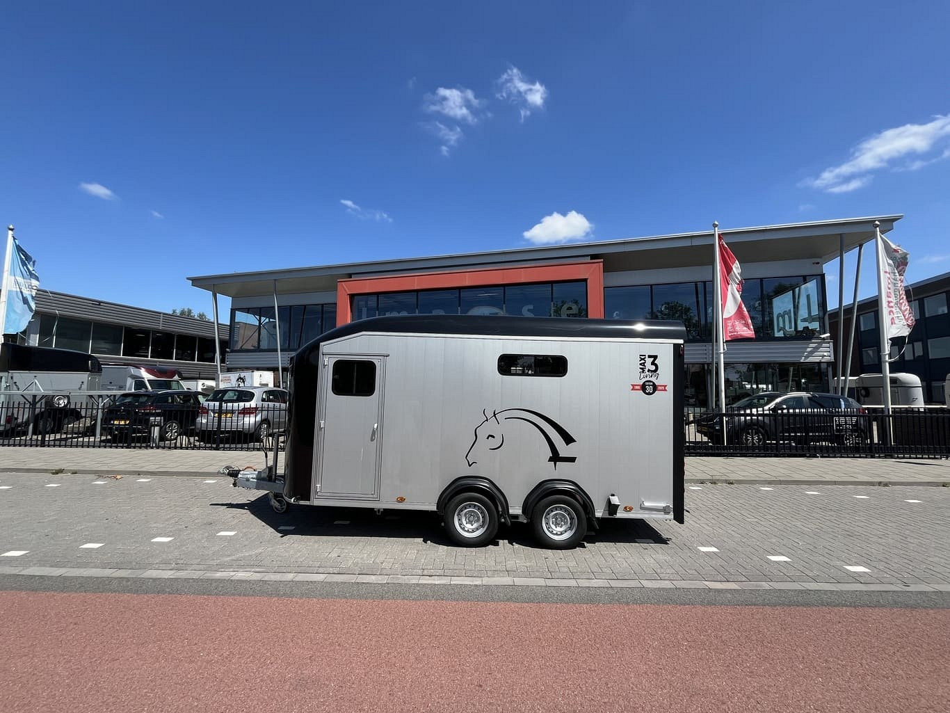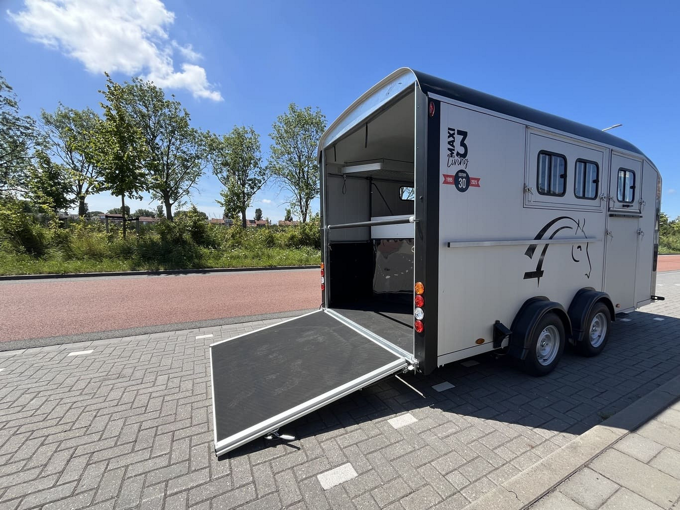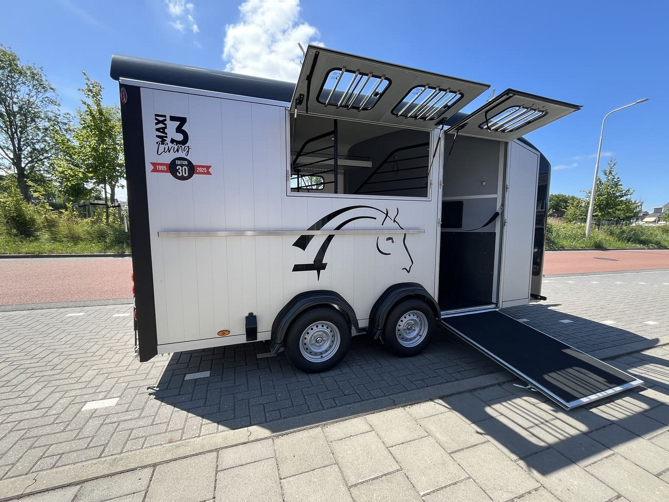 De Cheval Liberté Maxi 3 Living is een extra grote 3 paards trailer met vooruitloop en een living met bed, kasten en tafeltje. De Maxi 3 is uitgevoerd met aluminium vloer en aluminium zijwanden. Voorzien van 3 puntsluiting, schuifraam, verlichting, verstelbare zadelsteunen, spiegel, hoofdstelhouders, opbergnet.