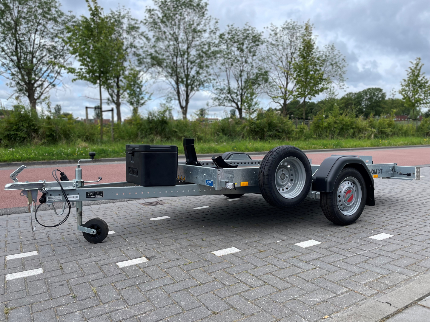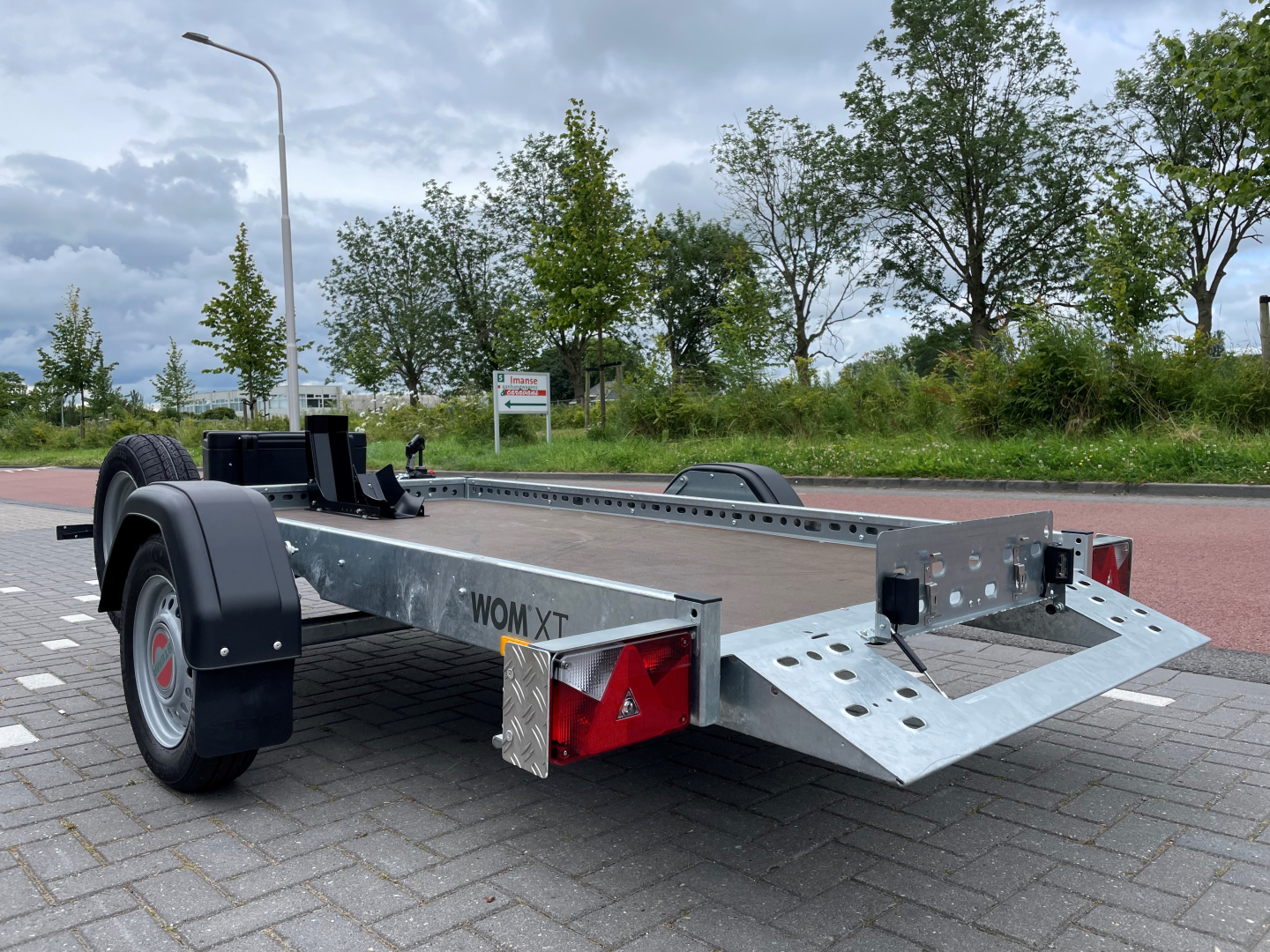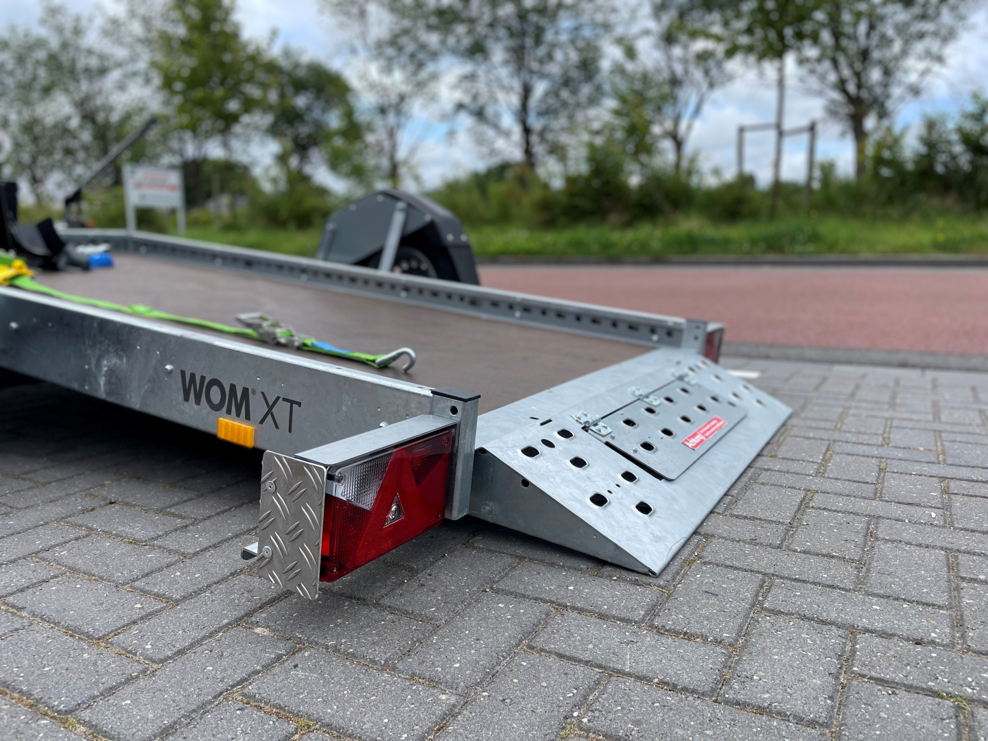 Deze Stema WOM XT 750 Kg geremde hydraulisch motortrailer zakt volledig naar beneden zodat er geen rijplaat meer nodig is.